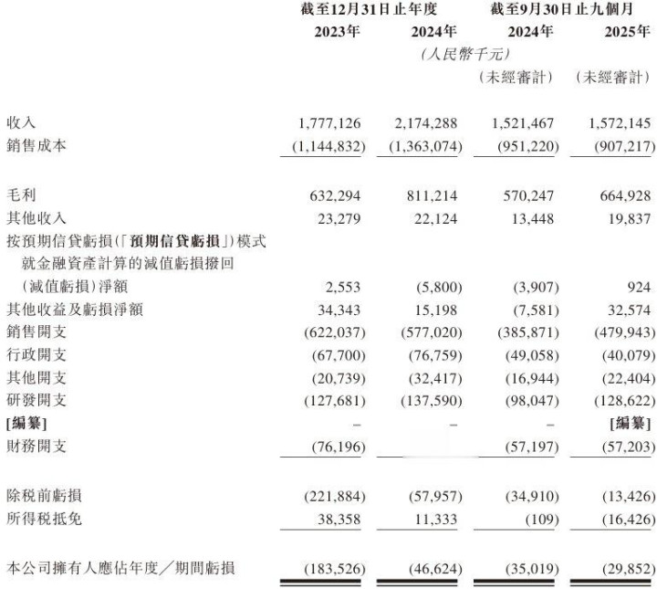 2023年、2024年及2025年截至9月30日止九个月,该公司拥有人应占年度╱期间亏损分别约为1.84亿元、4662.4万元、2985.2万元人民币。